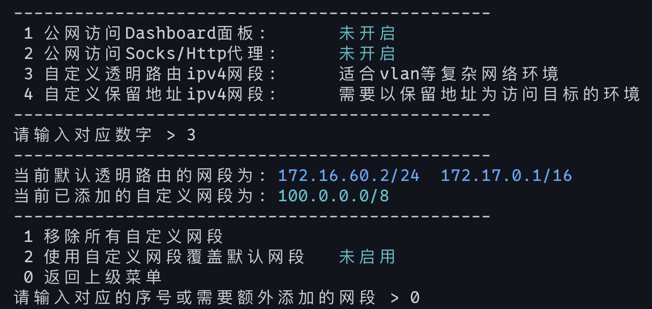进入 shellcrash 设置后,选择【7 内核进阶设置】-> 【3 配置公网及局域网防火墙】 -> 【3 自定义透明路由ipv4网段】-> 输入 100.0.0.0/8,保存并重启内核即可。